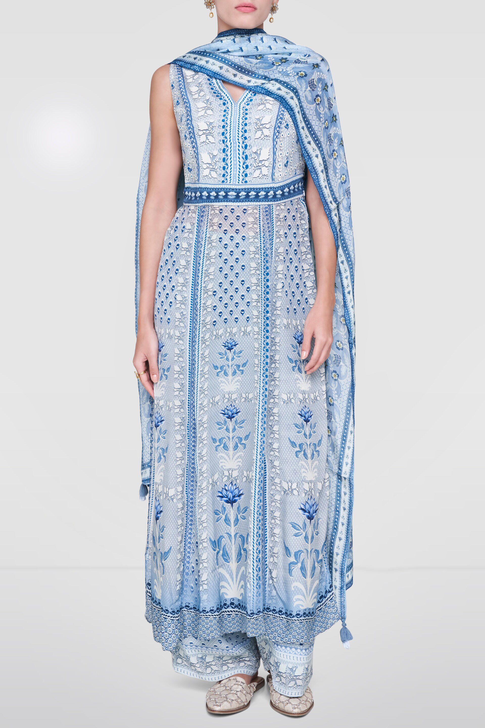 Dainty blue fern and floral motifs printed on delicate grey fabric. The sleeveless Advaita Set with Dupatta features a v-neckline,  and is paired with flowing bottoms and matching dupatta. Style Tip: Style this look with our hand embroidered mojris, statement silver earrings, and one of our embroidered potlis.